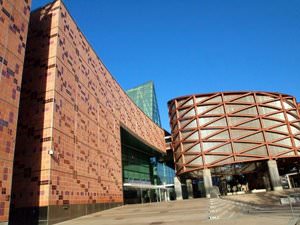 Главной особенностью постройки является ее ассиметричная форма, для облицовки фасада здания использовали специальные стальные панели, отполированные до блеска. С этой архитектурной особенностью здания связана одна из главных его проблем. После завершения отделки фасада выяснилось, что из-за полированных металлических пластин в некоторых соседних жилых домах концентрируется горячий воздух. Чтобы концертный зал не мешал местным жителям, конструкцию его фасада пришлось немного изменить. …