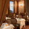 In een ruimte met houten muren met zijden wandbekleding en grote ramen met uitzicht op een typisch Venetiaans kanaal wordt een uitgebreid ontbijtbuffet geserveerd. Barservice is de hele dag door beschikbaar.