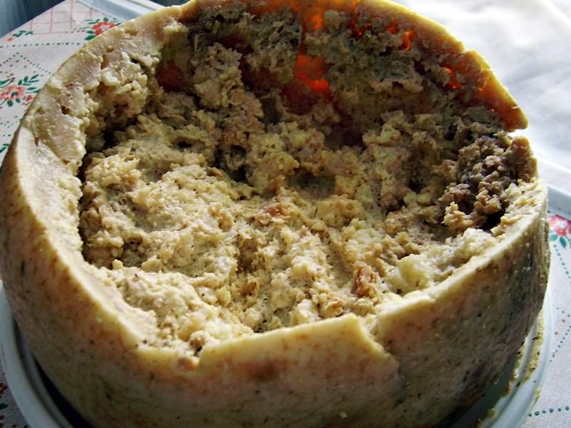 Auf der Suche nach neuen Geschmackserlebnissen gehen viele Käsefans nach Italien. So verwundert es nicht, dass man in diesem Land eine der schrecklichsten Käsesorten, Casu Marzu, probieren kann. Dieser Käse wird in Sardinien hergestellt. Der Name kann buchstäblich aus dem lokalen Dialekt als fauler Käse übersetzt werden. Diese würzige Sorte wurde auf der ganzen Welt berühmt, weil Käseblöcke mit Horden von Insektenlarven bevölkert sind.