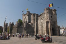 Gravensteen. Le château médiéval qui se trouve directement au centre de la ville. Le système défensif du château a gardé entièrement son aspect originel. Les portes de château, le mur de château et les écuries méritent aussi l’attention. De Gravensteen, l’histoire de qui compte 800 ans, les régents commandaient à toute la Flandre. Dans le château on installe le musée des tortures avec des instruments exposés des tortures. Le château Gravensteen est une des curiosités principales de Gand.