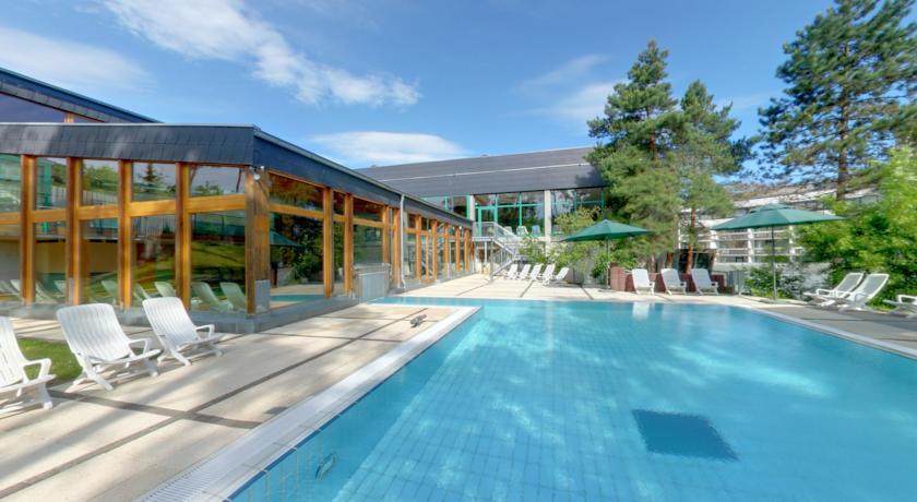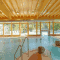 L'espace aquatique dispose d'une piscine intérieure et extérieure, d'un bain à remous, d'une cascade et d'un espace avec toboggans réservé aux enfants. Le jardin propose toute une gamme de saunas, de chaises longues et une douche extérieure.