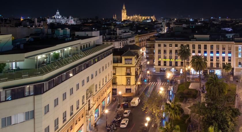 Le toit-terrasse du Derby offre une vue magnifique sur les célèbres sites touristiques de Séville. Vous y trouverez aussi un salon avec des fauteuils.