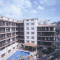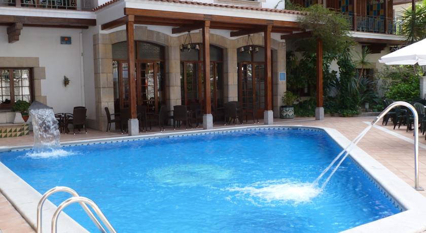 La piscine extérieure de l'Hotel La Carolina est dotée de jets hydromassants. Elle est entourée d'une grande terrasse avec des chaises longues.