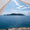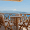 Sur la plage rocailleuse, les terrasses couvertes privées donnent sur l'île de Kastellorizo ​​et la Méditerranée. La terrasse de la piscine dispose de chaises longues et de parasols blancs élégants.